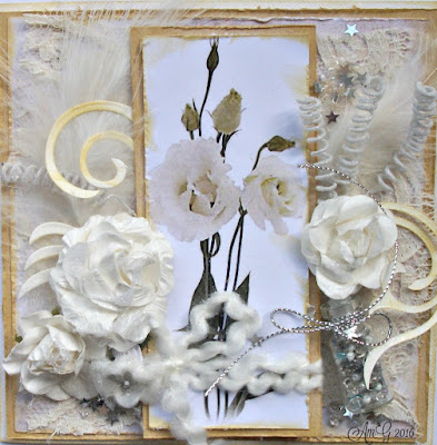 sheer ribbon with silver grey edges is looped, a large grey rose, white rose & rosebuds finishes floral spray, all tipped with white gesso.